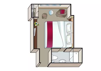 Each cabin features a spacious bathroom with a walk-in shower, luxurious Rituals bath products, and a hair dryer, along with a fixed panoramic window that fills the space with natural light. Thoughtful touches like a comfortable double or twin bed, generously-sized wardrobe, secure in-room safe, flat-screen TV, individual climate control, and direct dial telephone ensure a restful and well-equipped stay.