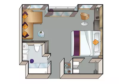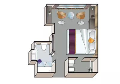 Each cabin features a spacious bathroom with a walk-in shower, luxurious Rituals bath products, and a hair dryer, along with a fixed panoramic window that fills the space with natural light. Thoughtful touches like a comfortable double or twin bed, generously-sized wardrobe, secure in-room safe, flat-screen TV, individual climate control, and direct dial telephone ensure a restful and well-equipped stay.