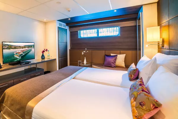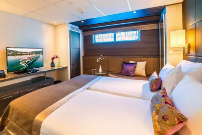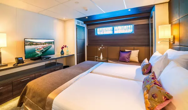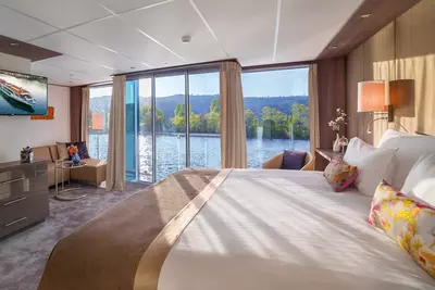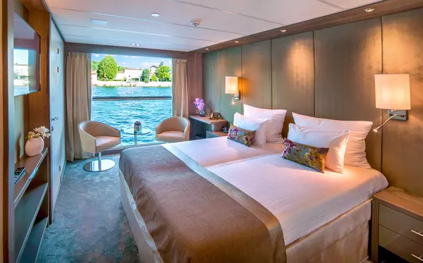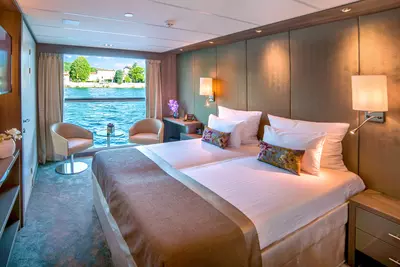 These staterooms feature the AMADEUS Signature Bed (available as a double or twin), a drop-down panoramic window for uninterrupted river views, a spacious bathroom with a walk-in shower and premium Rituals® bathing products, walk-in wardrobe, flat-screen TV, individual climate control, well-stocked minibar, in-room safe, hair dryer, and direct dial telephone — ensuring a comfortable and refined travel experience.