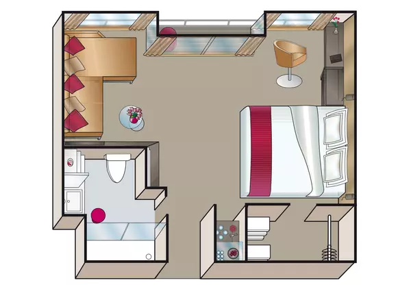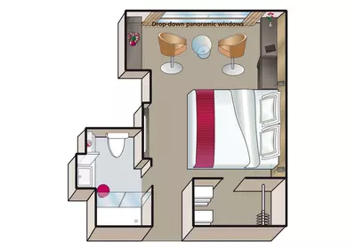 Each cabin features a spacious bathroom with a walk-in shower, luxurious Rituals bath products, and a hair dryer, along with a fixed panoramic window that fills the space with natural light. Thoughtful touches like a comfortable double or twin bed, generously-sized wardrobe, secure in-room safe, flat-screen TV, individual climate control and direct dial telephone ensure a restful and well-equipped stay.