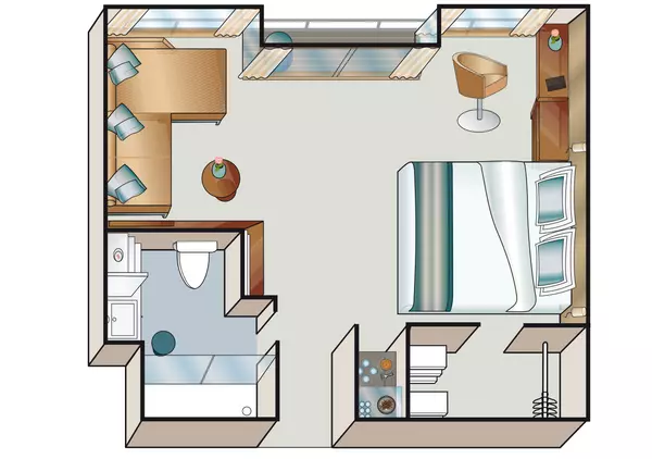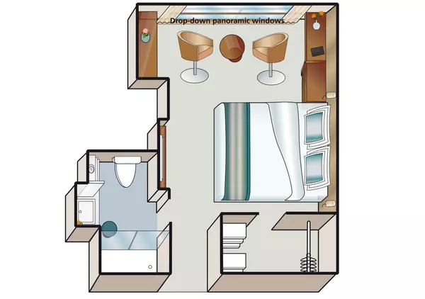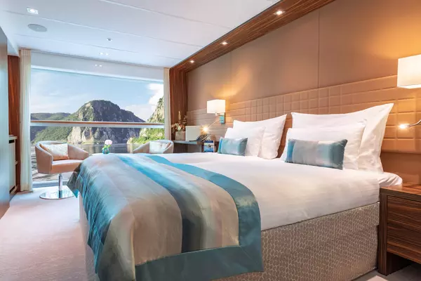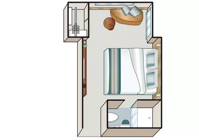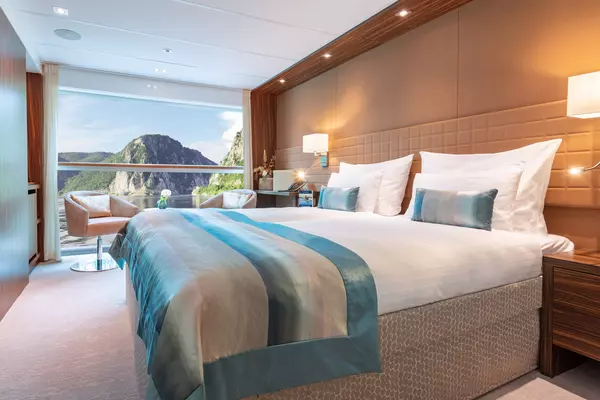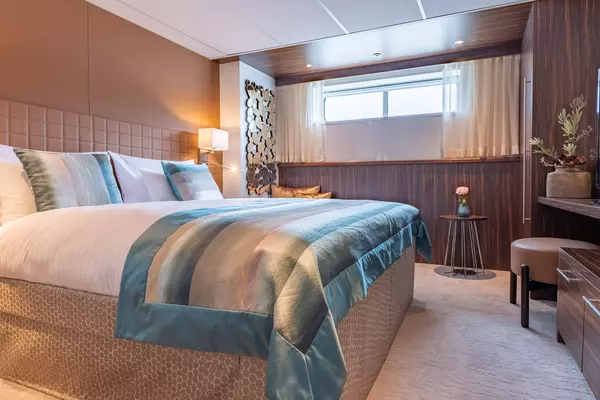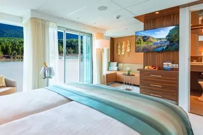 Each cabin features a spacious bathroom with a walk-in shower, luxurious Rituals bath products, and a hair dryer, along with a fixed panoramic window that fills the space with natural light. Thoughtful touches like a comfortable double or twin bed, generously-sized wardrobe, secure in-room safe, flat-screen TV, individual climate control, and direct dial telephone ensure a restful and well-equipped stay.