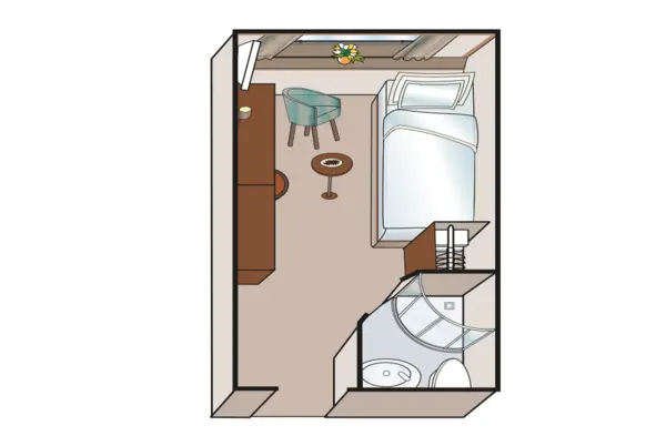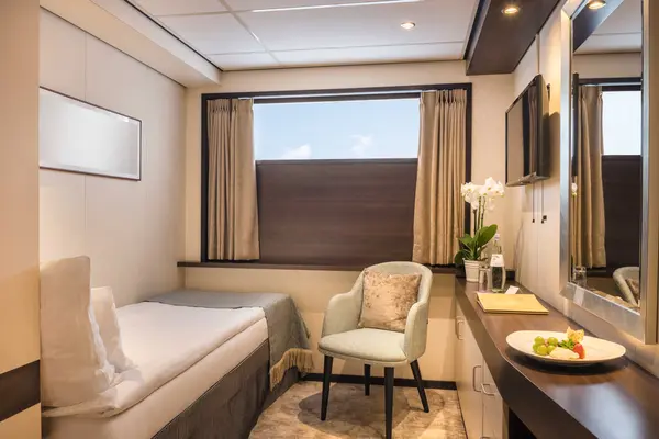 Each cabin includes a spacious bathroom with shower, premium Rituals® bathing products, and a hair dryer, along with a fixed panoramic window that welcomes natural light. Thoughtful details such as a comfortable single bed, practical storage space, secure in-room safe, flat-screen TV, individual climate control, and direct-dial telephone ensure you enjoy both convenience and relaxation throughout your stay.
