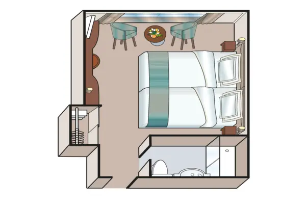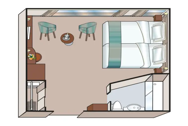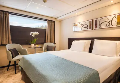 Each cabin features a generous bathroom with a shower, premium Rituals® bathing products, and a hair dryer, along with a fixed panoramic window that fills the space with natural light. Thoughtful touches like a comfortable double or twin bed, ample clost space, secure in-room safe, flat-screen TV, individual climate control, and direct dial telephone were designed to offer you both comfort and convenience throughout your stay.