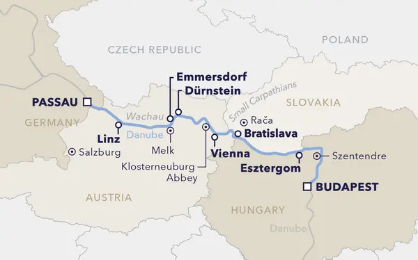 Nature, culture, and indulgence in perfect harmony — this cruise will stir the explorer in you. Over eight unforgettable days, you’ll journey from Passau to Budapest, discovering the most captivating cities of Germany, Austria, Slovakia, and Hungary: Linz, Vienna, Bratislava, and Passau impress with baroque façades, winding streets, and magnificent palaces. Between the cities, the Danube enchants with breathtaking scenery: the Schlögen Bend, the vineyards of the Wachau, and the legendary Danube Bend at Visegrád. Stories, flavors, and unforgettable moments await on this river cruise, where culture, nature, and comfort come together in perfect harmony.