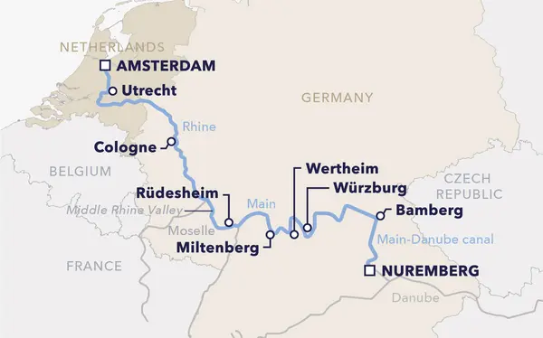Enjoy eight inspiring days that balance lively cities with tranquil natural scenery, visiting Cologne, Rüdesheim, Würzburg, and finally Nuremberg, where your journey comes to a memorable close.